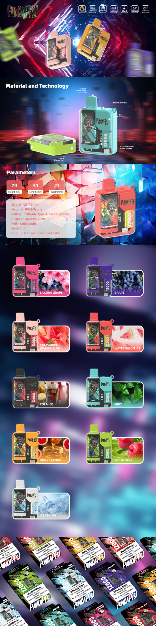泡芙: 12000 電池:可充電550mAh 充電:Type-C 煙油容量:20ml 尼古丁濃度:3%(30mg) 尼古丁類型: 尼古丁鹽 加熱元件:網狀線圈